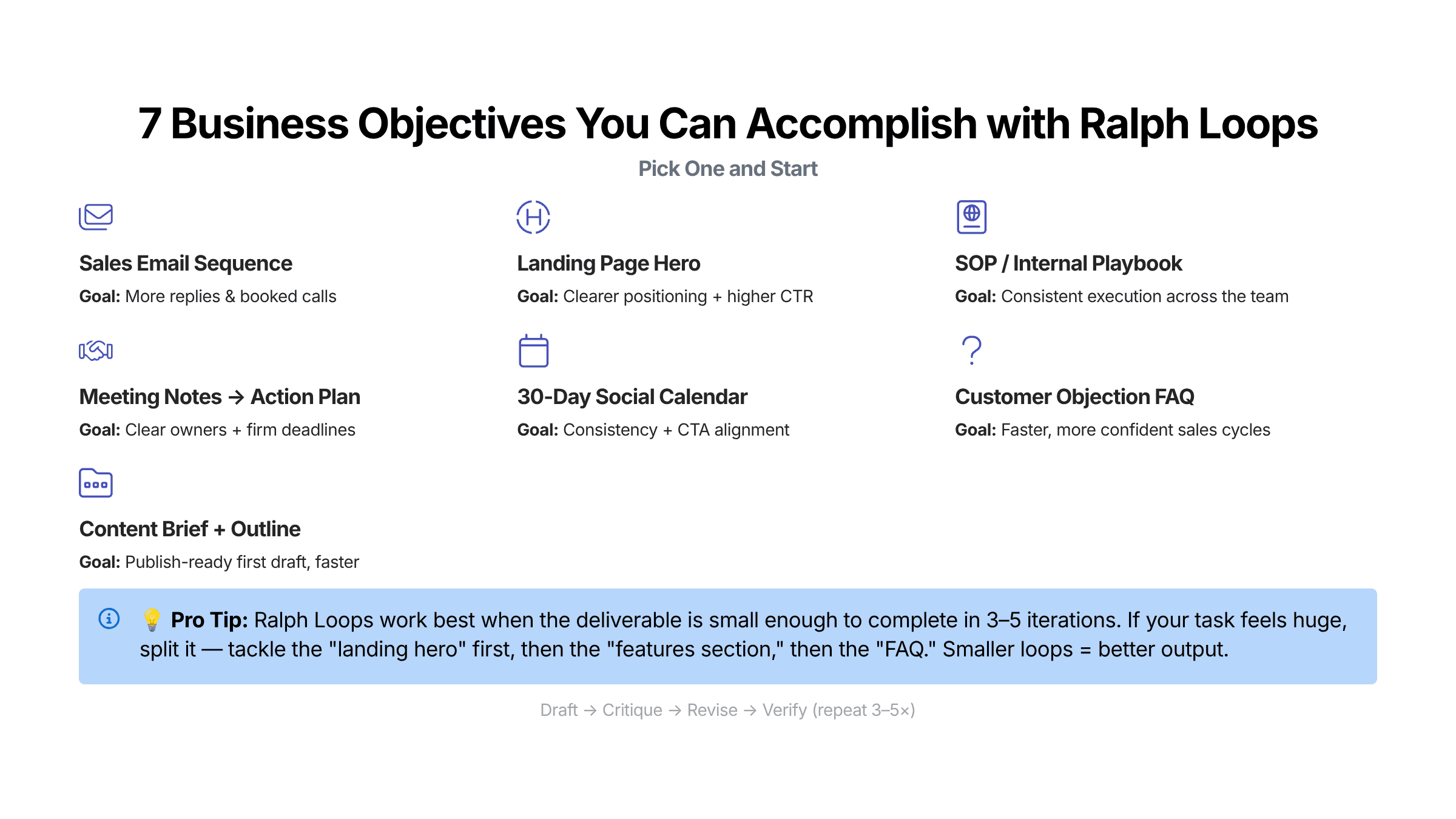 Learn how to run Ralph loops to reliably reach a business objective using AI—draft, critique, revise, and verify with clear stop conditions, rubrics, and templates.