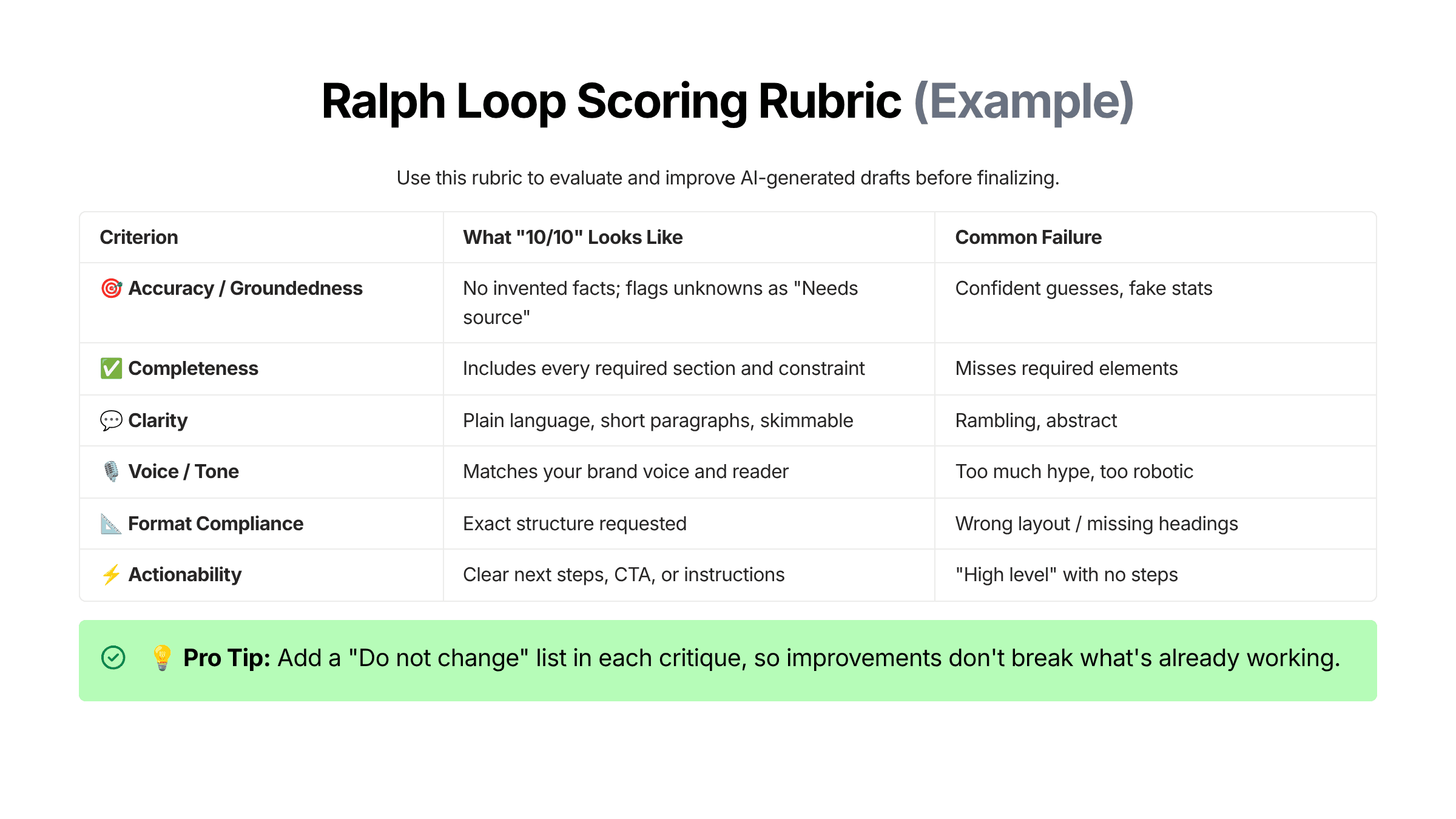 If v2 scores equal to or greater than 8 out of 10 across the rubric, you ship. If not, you run one more loop focused only on the lowest-scoring criterion (often clarity or format compliance).